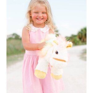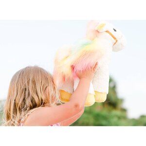 An exceedingly rare find, indeed. NEW — Luxuriously soft white faux fur. Rainbow wings, mane and tail with pink feet. Embroidered eyes that always see the best in you. Saddle comes with name code hidden in the pocket. Features: 12”L x 6”W x 14”H (30 x 14 x 28 cm) All new fabrics. Stuffing 100% recycled polyester.