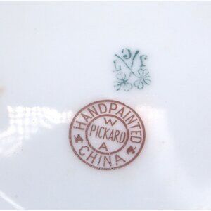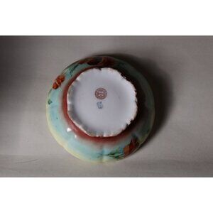 A charming antique hand-painted porcelain bowl by Pickard China, featuring vivid red-orange poppies with green foliage against a soft pastel background of yellow, aqua, and rose tones. The scalloped rim is accented in shimmering gold trim, and the interior boasts beautifully detailed brushwork. Marked on the underside with “Hand Painted Pickard China” and a green decorator’s stamp. A collectible example of early Pickard artistry, perfect for display or gift giving.