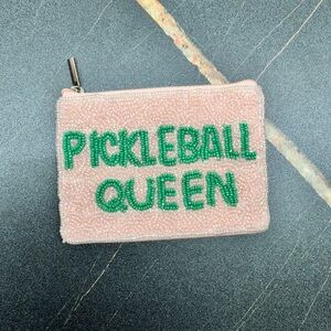 Stylish pink beaded pouch with 'Pickleball Queen' in green beads. Ideal for essentials.