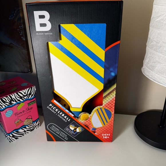 Experience the game with the pickleball paddle, featuring a striking blue and yellow design. Perfect for enhancing your performance on the court. New in box.