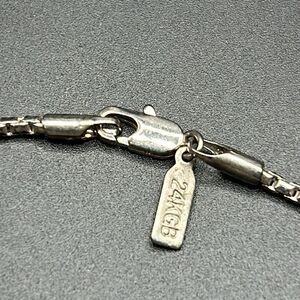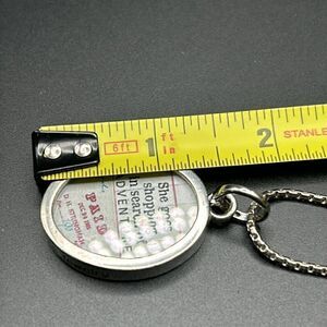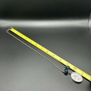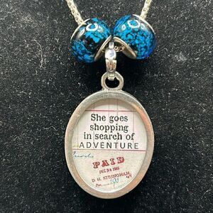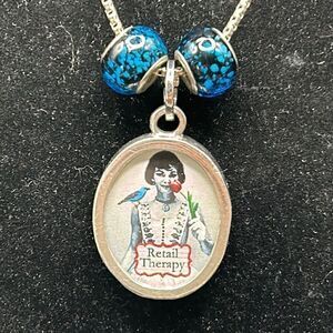 Silver tone rollo chain necklace with reversible pendant. One side says “Retail Therapy” and the other side says “She goes shopping in search of an adventure.” Two blue lucite beads. 13.5” drop. Good condition.