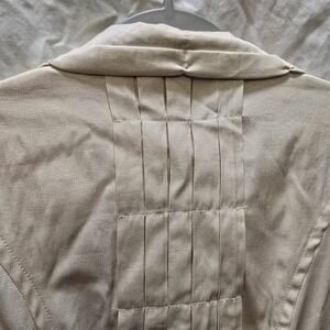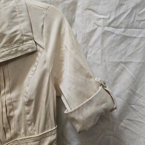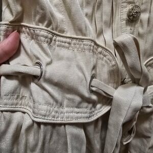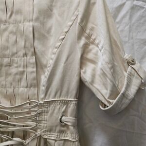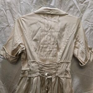 Picky Girl beige short sleeve shirt dress size large. Large silver toned grommets with a belt that weaves through, cute corset lace-up back detail. Beautiful buttons, collared, nice pleated details, knee length. No stretch.