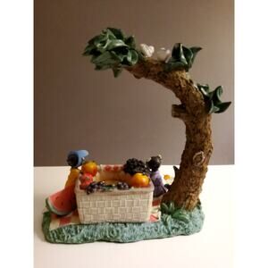 Pretty resin tea-light holder featuring ants having a picnic, a fruit basket, birds on a tree branch, and a red and white gingham blanket. Designed for use with a Yankee Candle tealights.