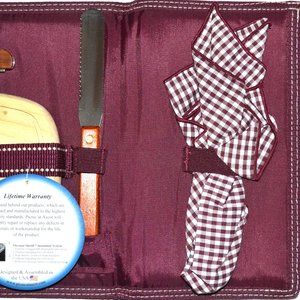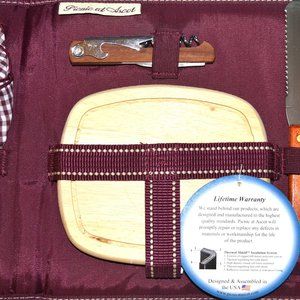 This cheeseboard set will fit in your picnic basket, backpack, tote bag. Great for lunch time outings. Comes with cheeseboard, 2 cloth napkins, knife, and wine bottle opener.