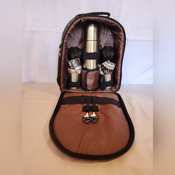 Good condition with original tags. includes 2 stainless steel mugs, 2 stainless steel containers for cream and sugar, 2 teaspoons and 2 cotton napkins. 14" X 5" X 11"