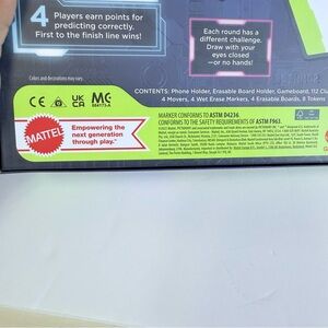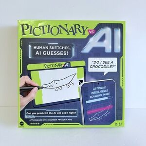 Pictionary vs AI board game with interactive AI features. Bright green and blue packaging. Brand new in the box