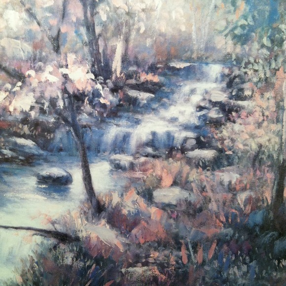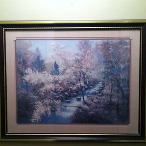 16x20 gold and brown frame -relaxing wooded area with stream flowing