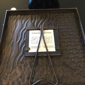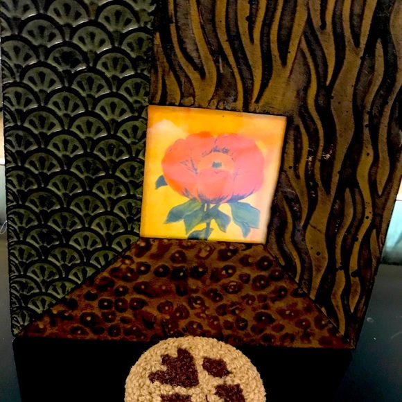 Pretty flower on metal. Can be hung on wall or set on counter or table top. I have so enjoyed it but have changed my colors.