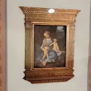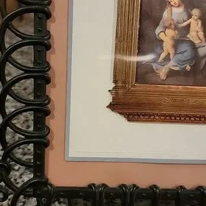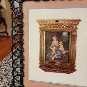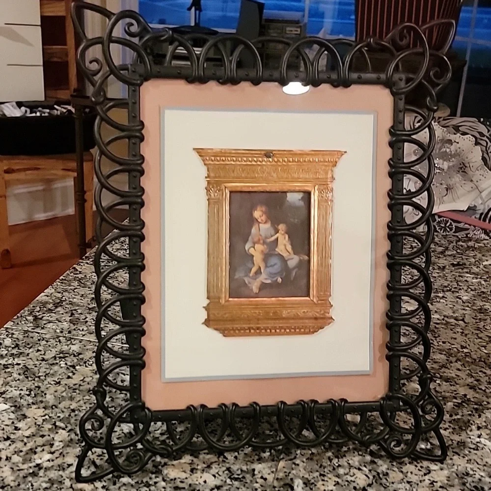 This a beautiful piece - a card that's been matted and framed in an Art Nouveau style black frame. I've used it during holiday season, but it can easily be a decoration for all the year. It can be hung or perched, as the visuals show the lean-to on the back. Dimension are 10x13" in the frame and 7 1/2 ×10 picture only ( out of frame )