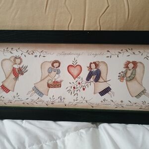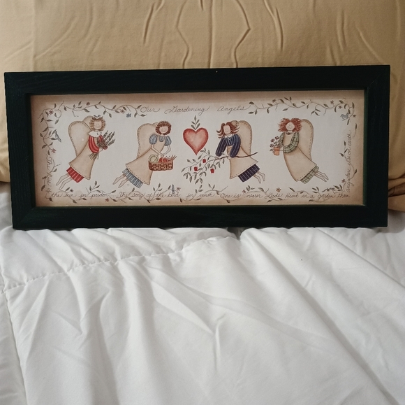 Cute 17x7 inch Our Gardening Angels picture. Folkart style. "The kiss of the sun for pardon...The song of the bird for mirth...One is nearer God's heart in a garden than anywhere else on earth." quote surrounds four Gardening Angels. Wooden frame is dark green.