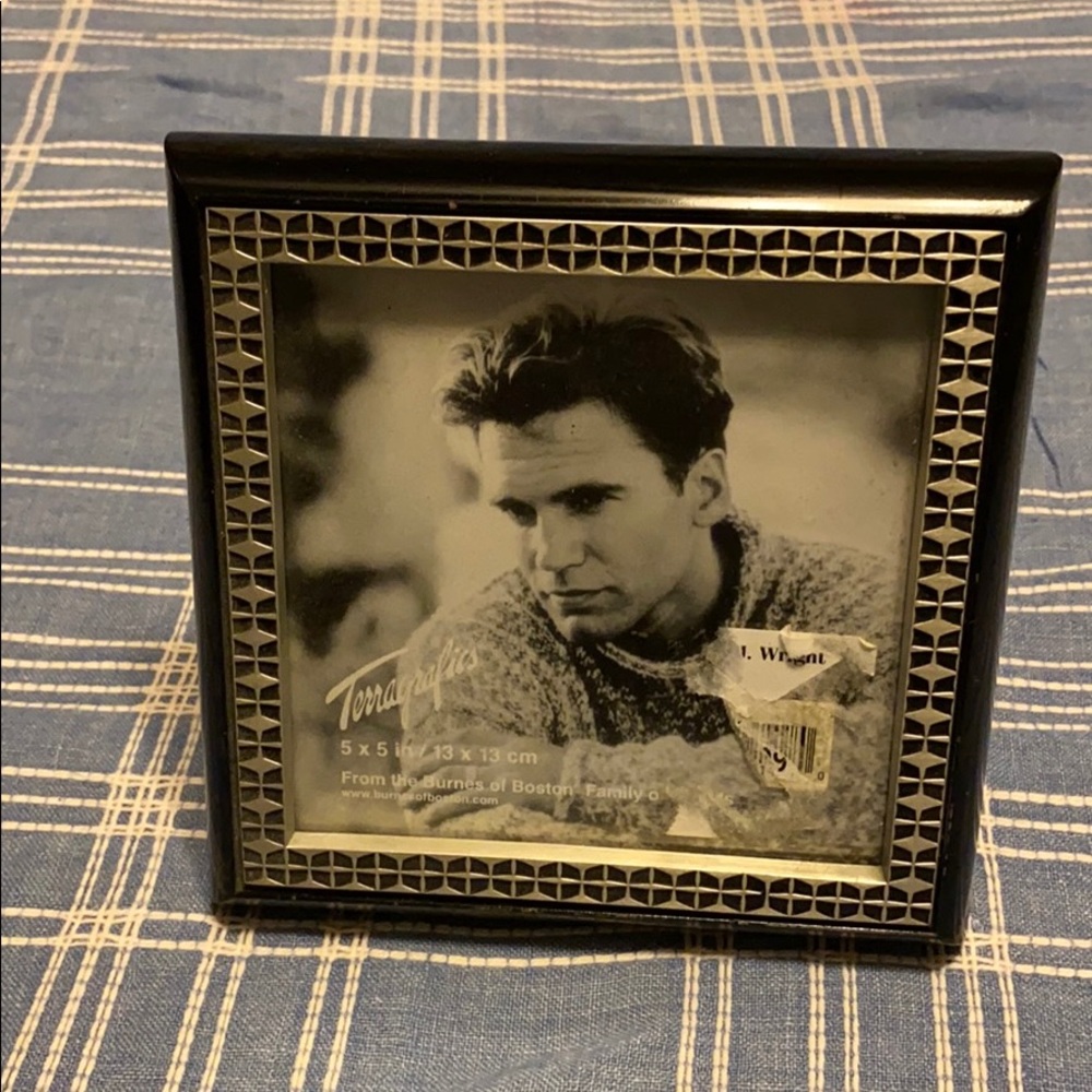 Black and silver “modern” square picture frame. Measures five inches by five inches. Sorry, the gentleman is not included.