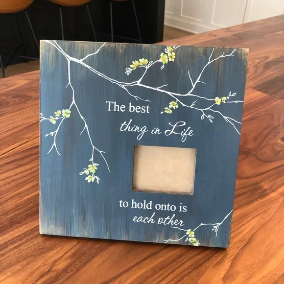 “The best thing in life to hold on to is each other”. Boutique picture frame purchased from a local florist. Grey distressed effect with white lettering and yellow flowers. Frame measures 10 1/4” x 10 1/4”. Insert measures 3 1/4” x 2 1/2”.