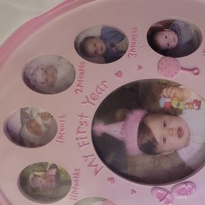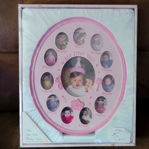 Princess and pink themed 1st year picture frame allows parents to catalog and display miniature photos from every month of the first year of life of a child. Unopened, unused, original frame.