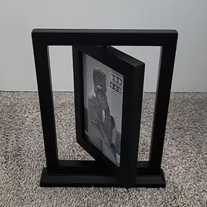 Double sided picture frame. 2 pictures can be placed inside this frame and the center rotates in a circle.