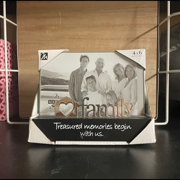 Brand new 4x6 picture frame from a smoke free home. The frame reads “ treasured memories begin with us”.