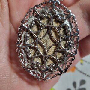 This vibrant gemstone pendant necklace, features an oval-shaped, polished Jasper gemstone Prong set within an ornate, stainless steel, filigree-style frame. The stone exhibits natural, earthy tones with distinct banded patterns in shades of tan, brown, and possibly subtle hints of other colors making it suitable for both casual and formal wear. The pendant is suspended by a 20 inch stainless steel chain with a lobster claw closure.