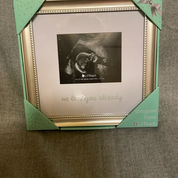 lol peach soma gram picture frame. 4x5 “we love you already” New in packaging. Would be a perfect baby shower gift for the new parents.. silver frame.
