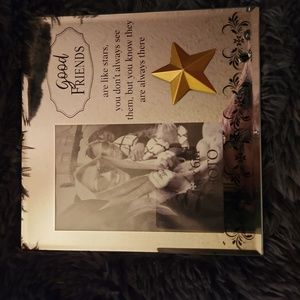 This is a beautiful mirrored picture frame with a small poem about good friends! It has a black design along bottom of frame and a bold gold star on it!! never been used! a great gift for any occasion!! The whole frame measurements are 8×8 and 51/2 × 31/2 for slot for actual picture!!