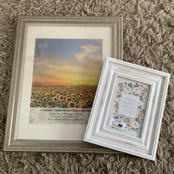 Large one is 10x13 or can use the matting inside to make it 8x10. Small one is 4x6 with distressed wood frame