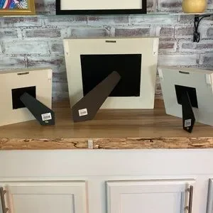 Set of three picture frames. Two, 3.5 c 3.5 and one 8 x 10. These can hang on the wall and also have a stand.