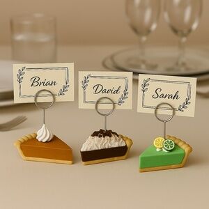 Add a sweet touch of charm to your table with this set of 4 handmade polymer clay pie slice place card holders! Each slice—Pumpkin, Cherry, Chocolate, and Key Lime—is carefully crafted to look like a mini dessert, complete with realistic details and a sturdy metal holder for cards.