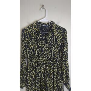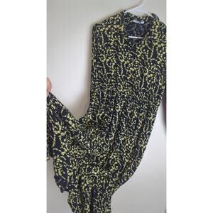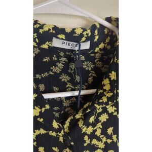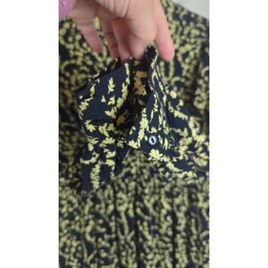 New without tags, button down top half, high elastic waist, cuffed button sleeves, ruffled skirt. Black fabric with a yellow cottage floral print. 100% viscose