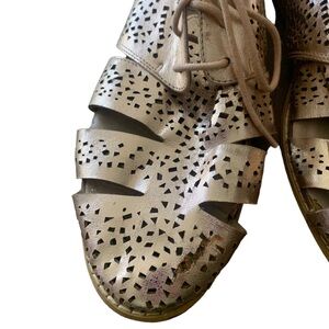 Pre-loved pair of Pied A Terre size 9 shoes. Wood sole. Laser cut details, lace up. Please note there are a few marks on these shoes, visible in photos. Lining also has some marks. Really cute and unique color.