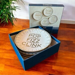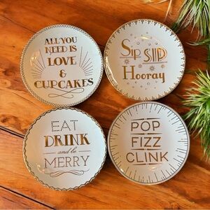 Fun and festive Pier 1 appetizer plates featuring metallic gold text, decorative rims, and fully gold bottoms. Each plate has a different phrase: