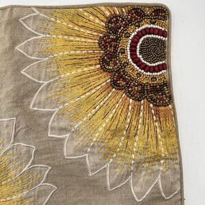 This decorative Pier 1 Beaded Embroidered pillow case displays a vibrant yellow sunflower pattern. Sized 19 1/2" x 14", it adds a pop of color and charm to any room. Comes with a zippered closure for easy use.