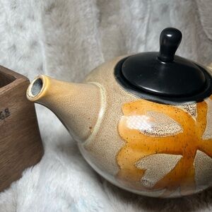 New without tags "Kioko" stoneware teapot by Pier 1 Imports features a speckled body with yellow flower and a black lid. Holds approximately 5 cups. Dishwasher and microwave safe.