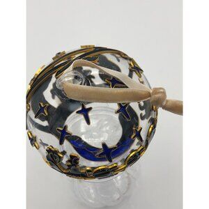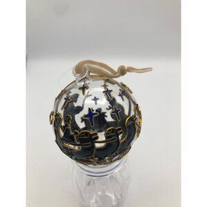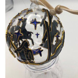 Pier 1 Imports Cloisonne Blown Glass Nativity Three Kings Christmas Ornament. The nativity pattern and the clear glass material make this ornament. It is black, navy and gold. The ball shape and hanging feature make it easy to display and the 3-inch size adds a touch of elegance to any room. Add this nativity and three kings ornament to your collection today and enjoy the beauty it brings to your home.