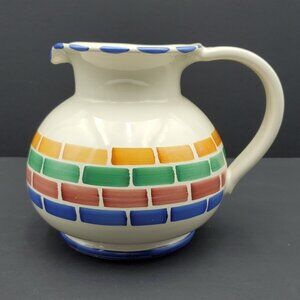 Pier 1 Pitcher. 6.75" tall and approx. 8" wide including the handle. Made in Italy, this colorful block design pitcher is an excellent piece for use or display.
