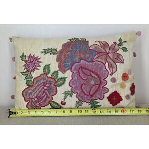 The Pier 1 Decorative Pillow is a charming and elegant addition to any home decor. With a beautiful embroidered red floral design, accented with gold glitter and crochet detailing, this pillow exudes a cottage-inspired style. The rectangular shape and size of 11 x 17 inches make it perfect for adding a touch of floral whimsy to a sofa or chair. The multicolor design and embroidered details give this decorative pillow a luxurious and unique look that is sure to enhance any room with its floral and garden theme.