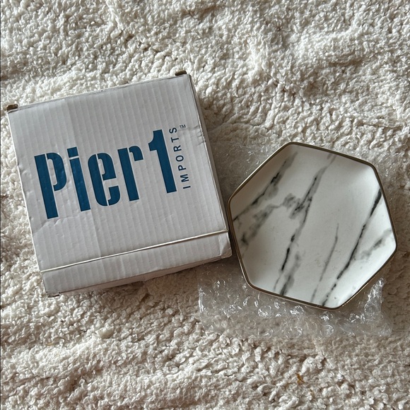Hexagon trinket dish with marble-look surface. Subtle gray veining across white base. Thin gold-tone edge for a refined touch.