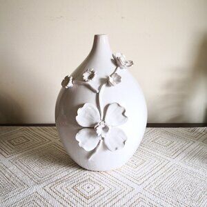Pier 1 Embossed Floral Ceramic Vase White 6" Dia. 11" H