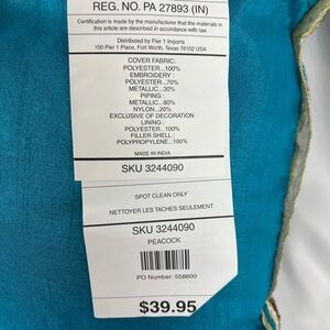 Gorgeous Pier 1 embroidered and beaded Peacock pillow was seasonally displayed in our guest room. Hidden back zipper with Pier 1 pillow insert. Measures approximately 23” long x 12” tall at widest points.