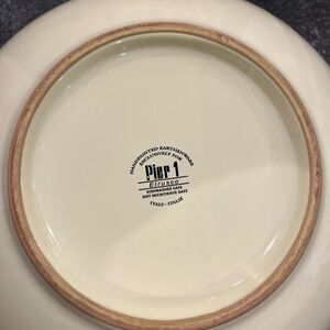 For sale is ONE (1) Pier 1 Etrusco Dinner Plate. The plates has orange & green bands, swirls and dots. The plate measures 11 1/2 inches and is in excellent condition. It's handprinted and made in Italy! Amazing art piece!