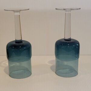 Pier 1 Goblet Blue Water 12 Oz Double Dip Mouth Blown MCM Style Wine Glass Pair