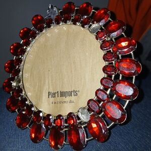 glass jewel framed photography frame with selective metal wire kickstand or suspend on wall. Red glass jewels layered and surround entire frame (a few gems missing yet can be replaced wether owners choice or exact ) made by pier 1 imports