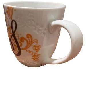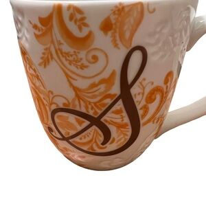 Great condition. Pier 1 Imports. Ava monogrammed coffee mug. Porcelain. White with orange/ tan damask pattern with brown cursive S. textured floral pattern. Dishwasher and microwave safe. Approx. 4.25” tall 3.5” across top. Smoke free home. No trades, offers welcome.