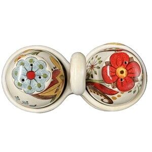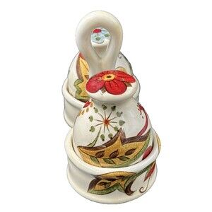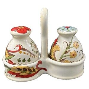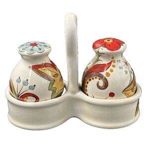 Add the sophisticated floral patterns of these Pier 1 Carynthum ceramic salt and pepper shakers to your dining experience. This set of two in a beautiful multi-color design with a matching caddy holder will elevate your tablescape for any occasion.