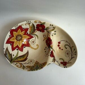 Stunning hard-to-find kidney-shaped chip and dip bowl by Pier 1. Lovely colors and floral pattern called Carynthum. No chips/cracks/apparent flaws. Measures 12 1/2” x 8 1/2” x 4 1/4”.