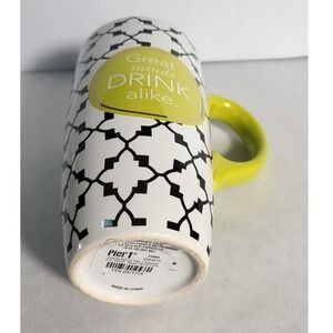 Elevate your morning ritual with this charming Pier 1 Imports coffee mug. The tall silhouette and eye-catching black and white geometric pattern create a modern, stylish look. A vibrant green handle and a playful "Great minds DRINK alike" message add a touch of whimsy. This mug is perfect for enjoying your favorite hot beverage at home, in the office, or as a thoughtful gift for a friend.