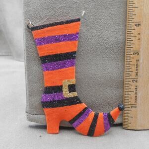 Pier 1 Imports Halloween Ornament Witch Boot Orange Glitter Metal. Vintage Pier1 Halloween Retired Ornament. Orange, Purple, and Black Striped Witch Boot. Approximately 4 inches tall, made from metal, and covered in glitter. Please see pictures.