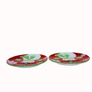 Pier 1 Imports Jolly Holiday Snowman Collection Dessert Plate Set of 2 Christmas Party Replacement Plates 9" Red Green White Hand Painted