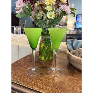 Retro style lime green martini glasses. 8” tall with white inside color. Pier 1 sold these and they are hard to find. Grab them now while you can!