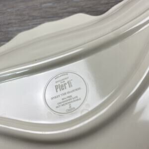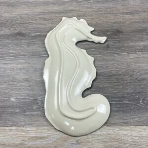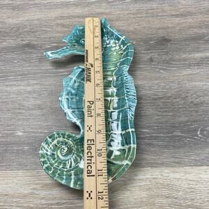 The Pier 1 Imports Melamine Hors d'oeuvre Plate "Spikey The Seahorse" is a 12" long tray featuring a seahorse print pattern in aqua blue color. This straight-shaped plate has one compartment and is made of melamine material. Manufactured in 2015 by Pier 1 Imports, this nautical-themed plate is dishwasher safe and perfect for all occasions, adding a touch of seahorse charm to your dining experience.