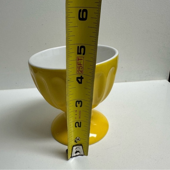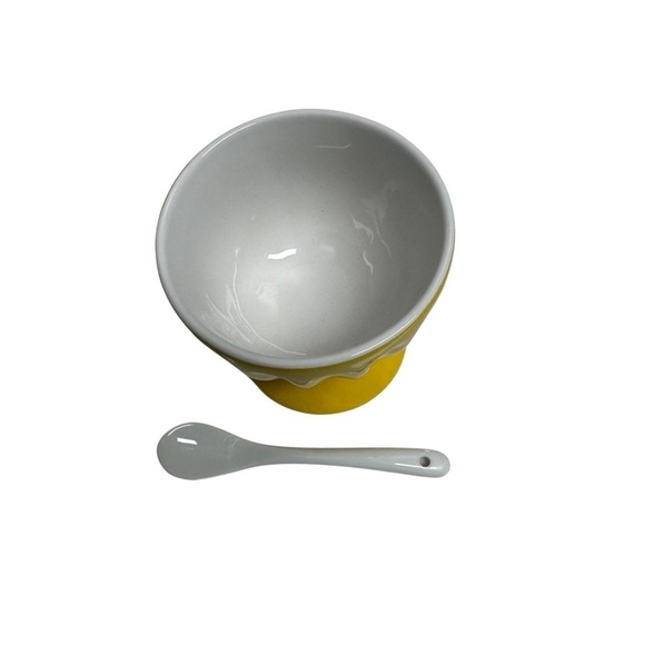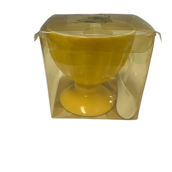 Pier 1 Imports One Ice Cream Bowl Yellow Stoneware With Spoon New In Box. Plastic Box is the one shown in photo. Older box has some dings due to age. No tags.