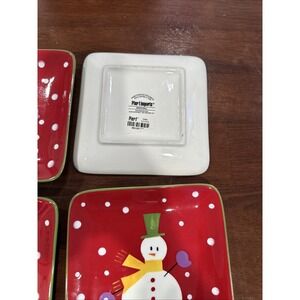 The Pier 1 Imports Snowball Appetizer Dessert Plates Snowman Set features four ceramic dessert plates in a square shape, each measuring 6 inches in diameter. Decorated with a charming snowman design in red, these plates are perfect for Christmas or winter-themed occasions. They are microwave and dishwasher safe, making them convenient for everyday use. Made in China, these plates are a delightful addition to your dinnerware collection.