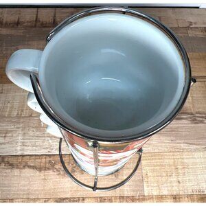 This Pier 1 Imports stacking mug set features a festive snowman design, ideal for holiday entertaining or personal use. Made from durable porcelain, these mugs are perfect for serving hot beverages. The set includes a metal stand for convenient storage and display. Ideal for adding a touch of holiday charm to your collection.